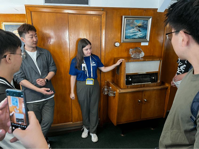 破冰船分布在俄罗斯的几个港口,大部分在圣彼得堡和摩尔曼斯克,以及阿尔汉格尔斯克、符拉迪沃斯托克、加里宁格勒等地。俄罗斯现今最古老的破冰船是1917年建造的“克拉辛”号破冰船,它服役到1998年,然后改造成一座博物馆安置于圣彼得堡的码头港口。7月10日,参访团队登上了停靠于涅瓦河畔的“克拉辛”号破冰船进行参观学习。从船员活动室到船长室,同学们穿梭于木质走廊之间,仿佛历经了“克拉辛”号出海执行任务的时刻,看见了他一船破万冰的威风凛凛。讲解员对一件件木质家具用途的介绍让同学们对船上的生活充满遐想,这艘古老的破冰船让参访团队更加体验到了海上力量的不可或缺。