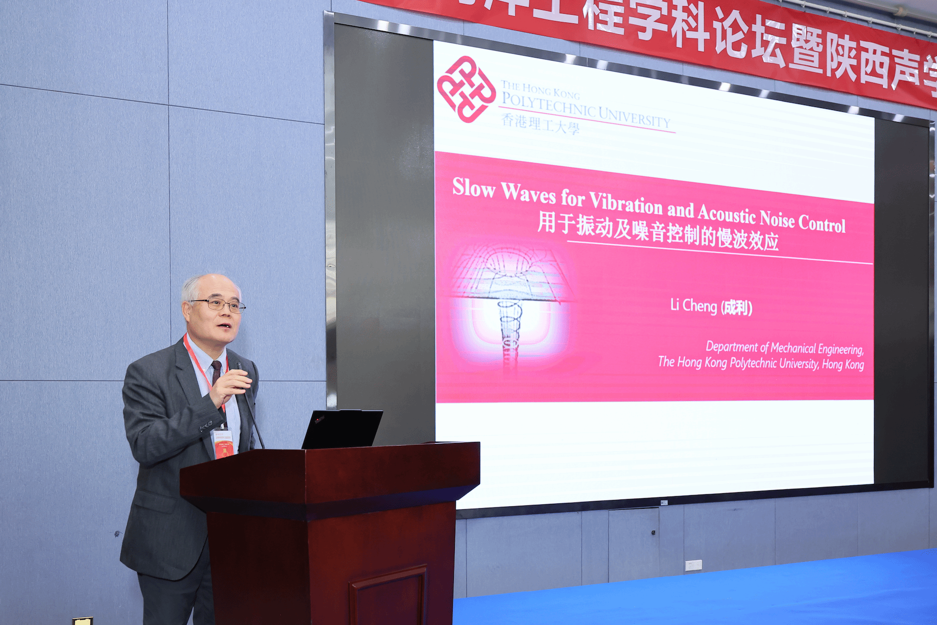 开幕式后,成利院士以《用于振动及噪音控制的慢波效应》为题作主旨报告,介绍了研究团队在ABH和SBH方面取得的研究进展,展示和讨论了基于慢波的振动和噪声控制技术的突出现象、基本物理原理、建模和分析工具以及潜在应用。