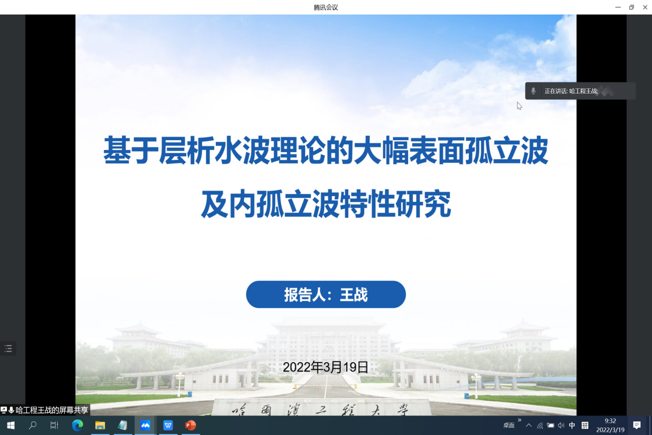 杜鹏副教授的邀请,哈尔滨工程大学船舶工程学院和哈尔滨工程大学青岛创新发展中心联合博士后王站,在线上为学院师生作“航海大讲堂”系列讲座(十四)——《基于层析水波理论的大幅表面孤立波及内孤立波特性研究》的学术报告。会议由杜鹏副教授主持,学院10余名师生参会。