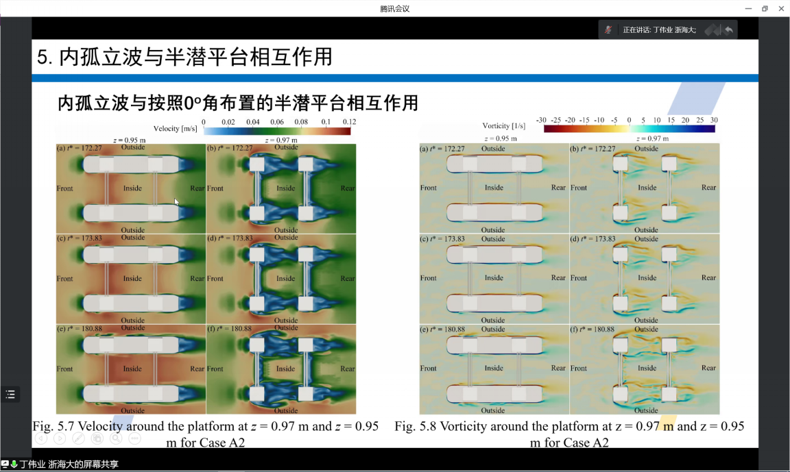 丁伟业从内波的概念、产生的原因及其对潜艇和海洋平台等结构物的危害全面介绍了内孤立波的研究背景及意义。接下来具体解释了重力塌陷方式造波的原理,并通过大量的案例分析了波幅比和波长比与坍塌区高度比、坍塌区长度比、分层流体深度比及密度比之间的关系。随后将重力塌陷方式造波与KdV、eKdV、mKdV和MCC理论速度入口造波进行了对比分析,从内孤立波与海底等腰三角形障碍物、半圆形障碍物及斜坡之间的相互作用揭示了内孤立波的传播演化规律,从内孤立波与单个圆柱、变形圆柱、串联双圆柱的相互作用分析了水平圆柱的水动力特性,并介绍了水平圆柱与半潜平台之间的联系。最后从内孤立波与半潜平台的相互作用分析了内孤立波与不同角度半潜平台之间相互作用的水动力特性。
