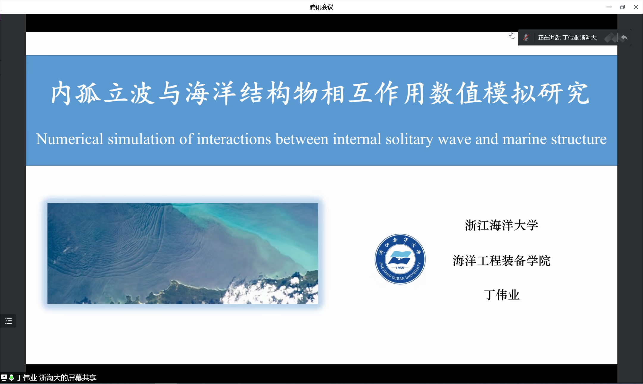 杜鹏副教授的邀请,在线上为师生作“航海大讲堂”系列讲座(二十二)——《内孤立波与海洋结构物相互作用数值模拟研究》学术报告。会议由杜鹏副教授主持,新加坡国立大学、浙江海洋大学、本校果冻传媒