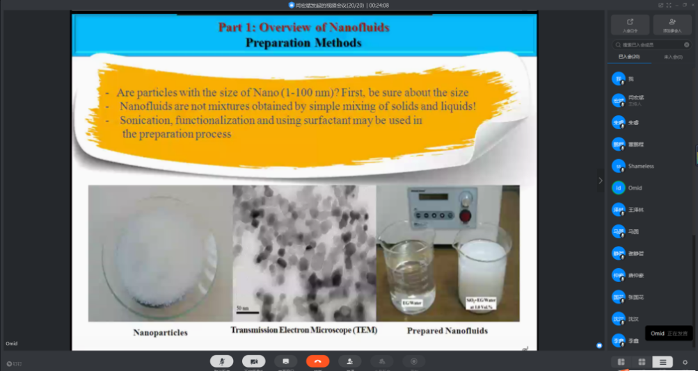 首先,Omid Mahian教授回顾了纳米流体的发展历程,分享了制备纳米流体的一步法及两步法,并指出了纳米流体在工程应用方面面临的成本、稳定性、耗功及设备腐蚀等方面面临的挑战。