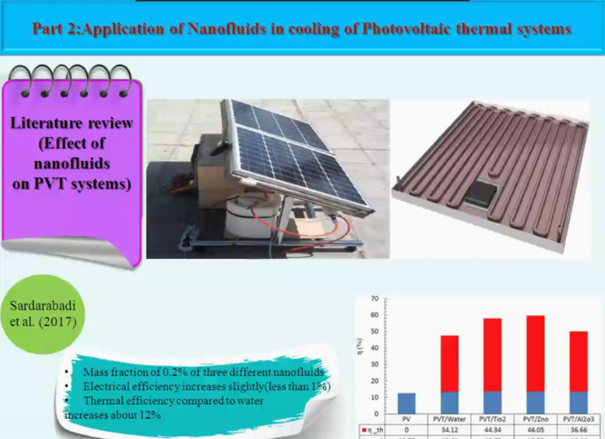 随后,Omid Mahian教授着重讲授了纳米流体在太阳能集热器、太阳能光伏板冷却及太阳能海水淡化中的应用。报告系统地分享了纳米流体种类、浓度等参数对集热器效率、光伏板冷却性能及淡化系统淡水产量的定性与定量影响。