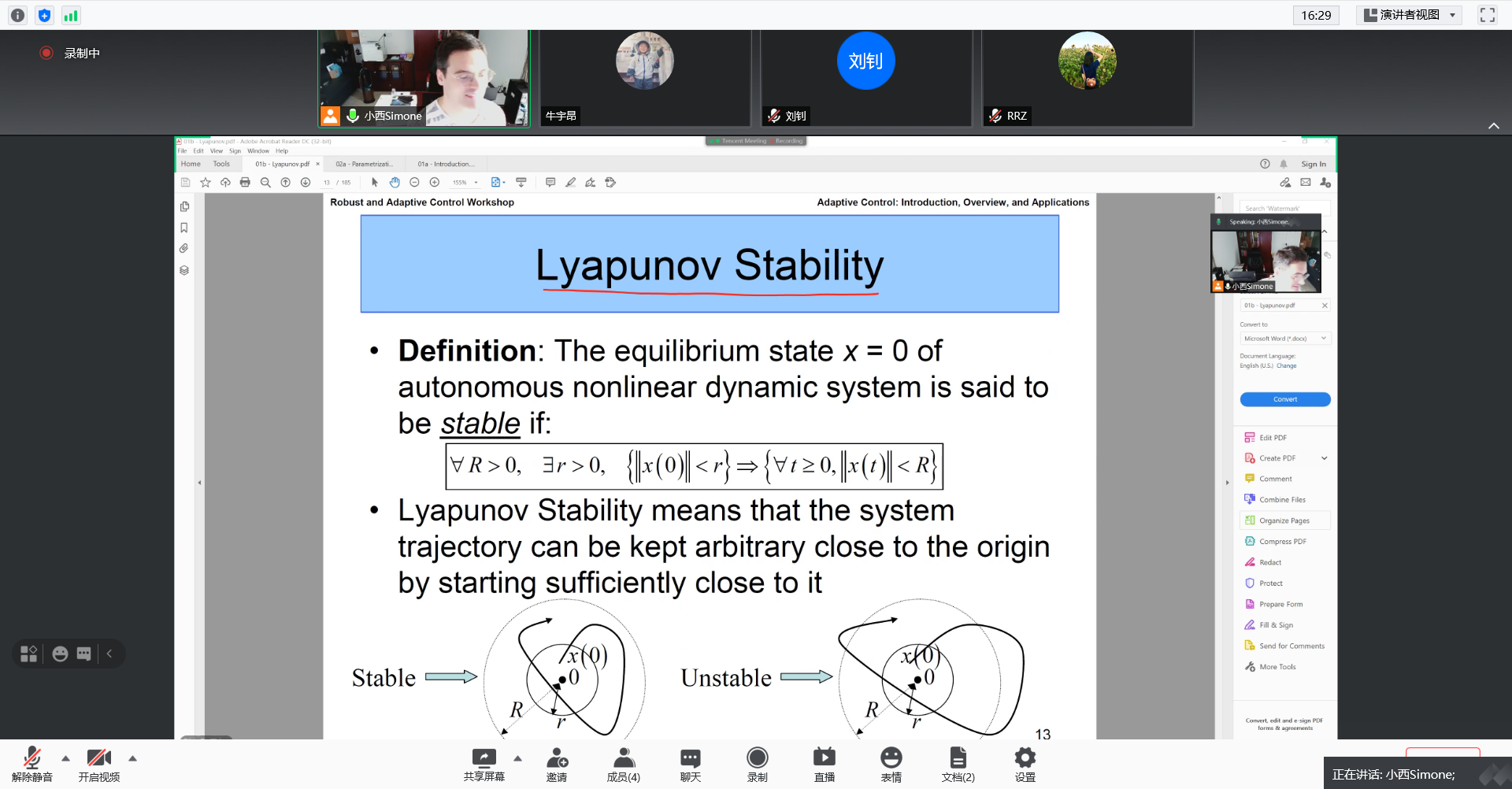 李乐老师邀请,荷兰代尔夫特理工大学Simone Baldi老师于线上开展自适应控制及应用课程,选课学生一共16人,其中2名本科生,14名研究生,本课程一共16学时,主要讲授自适应控制理论及其应用。介绍自适应控制系统分析和设计的基本理论和方法,包括前期知识,模型参考自适应控制、鲁棒自适应控制、自适应切换控制等;并结合实例介绍自适应控制在无人机路径跟踪、无人车编队保持等无人系统控制问题中的应用。