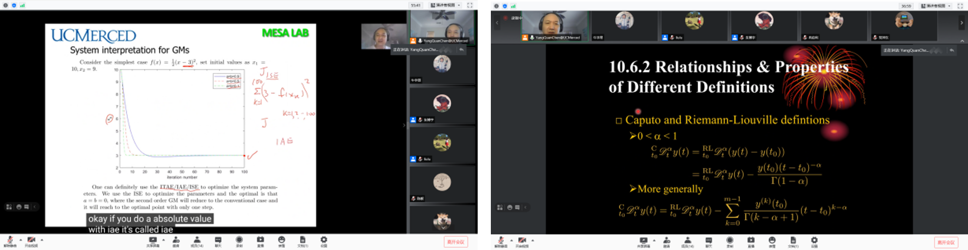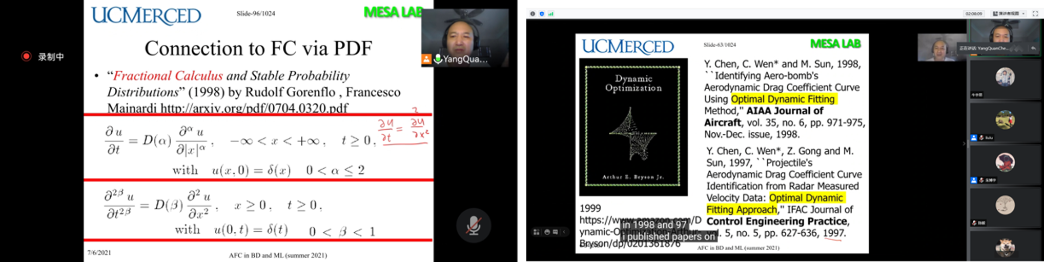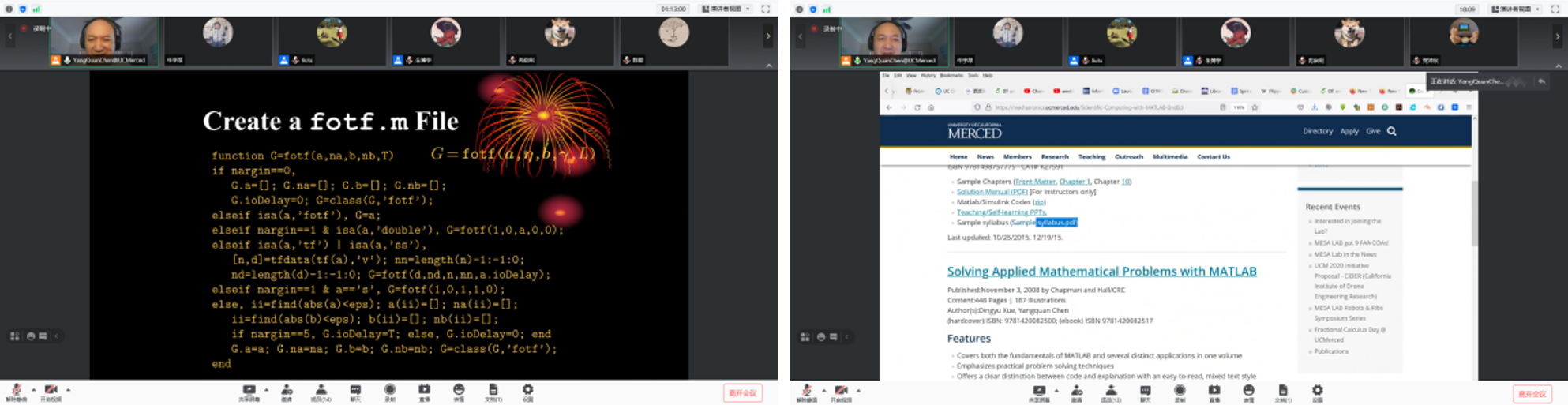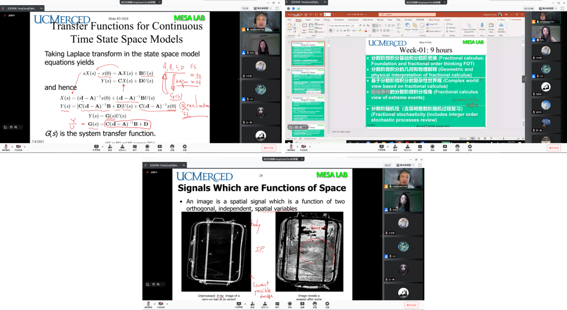 刘禄老师邀请,加州大学默塞德分校工程学院YangQuan Chen教授于线上开展分数阶微积分与机器学习课程,选课学生一共20人,其中本科生9人,研究生11人,本课程一共32学时,以分数阶微积分(非整数阶微分或积分)及其在大数据和机器学习中的应用为主线,介绍国际热点研究问题分数阶微积分基础和分数阶思想、分数阶微积分与大数据、机器学习的关联,并介绍数值分数阶微积分技术、分数阶梯度和静动态最优化问题等,以及复杂动态系统的分数阶动态建模和控制、分数阶信号处理的基础知识。