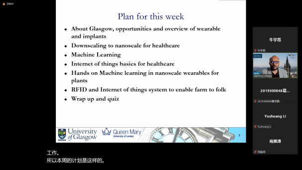 杨可老师邀请,格拉斯哥大学Qammer H. Abbasi教授于线上开展体域网技术的发展与未来课程。本课程的主要目的是为了让学生了解通讯技术的前沿发展,比如物联网、纳米无线网以及诸如机器学习、UWB等相关基础技术的发展现状。通过这些基础技术的学习,希望学生能够对信号处理以及大数据相关的前沿科技有所了解。同时为了满足低年级本科生的选课需求,课程难度进行了适量调整,内容侧重于对和体域网相关的各种前言学科的介绍。