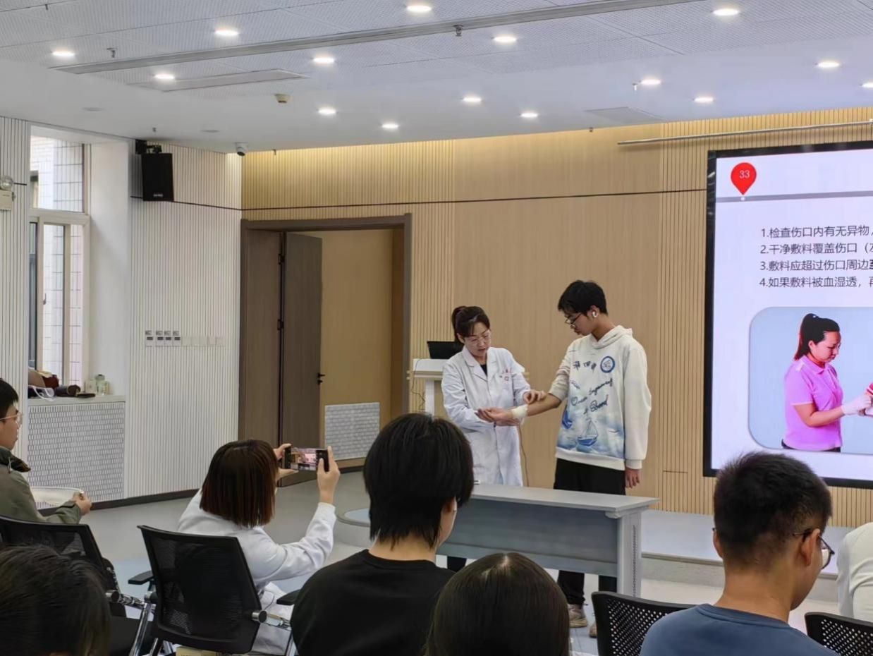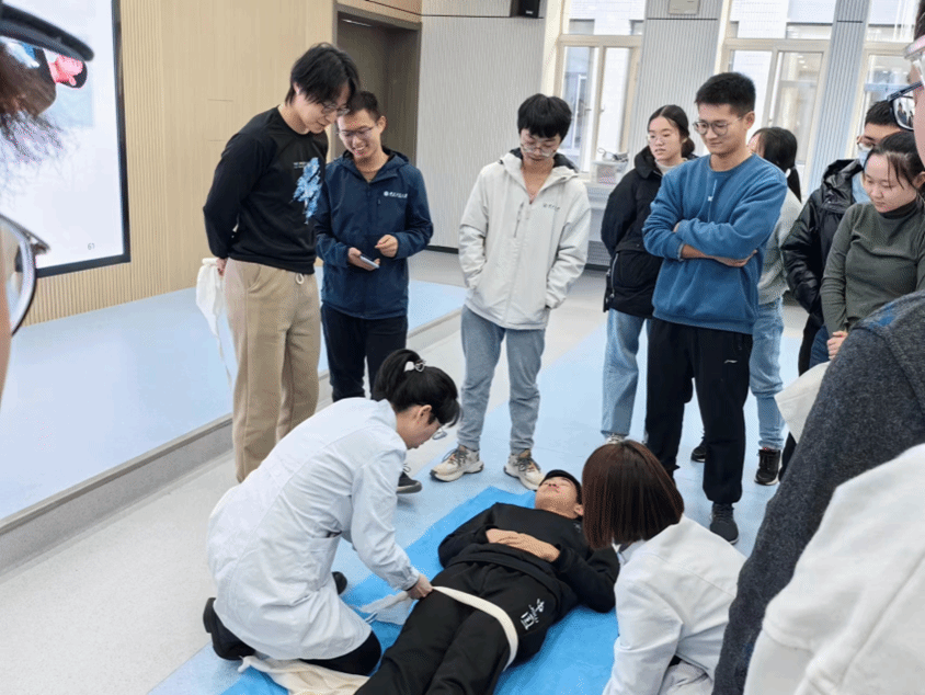 为提高培训质量,门诊部医护人员组织同学们两两分组现场实操,手把手教学,确保参加活动的每一位同学都能掌握创伤救护技能,在紧急时刻能够采取正确的急救措施。