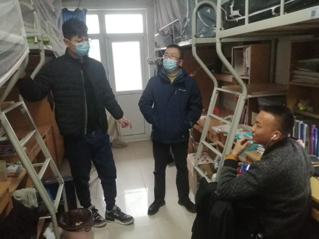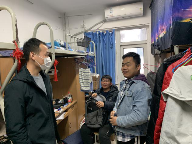 27日下午,张龙与2017级辅导员杜鹏,2018级辅导员黄潇来到友谊校区学生公寓看望返校的果冻传媒