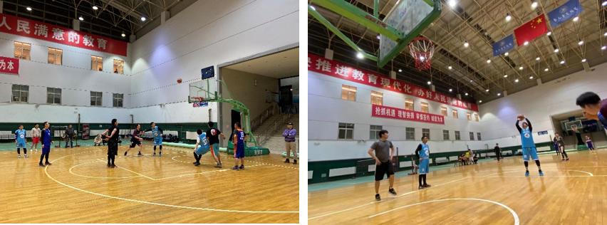随后,随着裁判一声哨响,比赛在轻松的氛围中开始,比赛采用四节制,每节比赛采取25分制,总分先得100分的队伍获胜,也寓意着为中国共产党诞辰100周年献礼。教工篮球队在前两节以犀利的突破、精准的投射能力逐步领先。随着下半场学生代表队找到比赛节奏,以充沛的体能和精准的三分逐渐将比分拉进,比赛攻防转换速度不断加快,最终占到上风。比赛中,师生不断交流战术、打法,激情碰撞、欢声笑语;节间休息老师们便询问同学们的就业去向、离校时间等,嘘寒问暖、关心备至。本次比赛师生之间加强交流、沟通感情,享受运动的快乐,展现了我院师生良好的精神风貌,同时也使毕业生深深感受到学院的关怀。最终比分定格在100:93,学生凭借良好的体能跟默契的配合赢得了比赛。