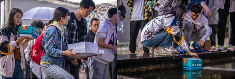 一方面是对纸船结构的创新,除了传统的盒型纸船外,有的小组尝试制作的锥形纸船,分片纸船,阀形纸船都令在场的同学眼前一亮,同时也有部分参赛同学在传统构型上寻求新的发展,在诸如支撑结构等方面进行新的探索。