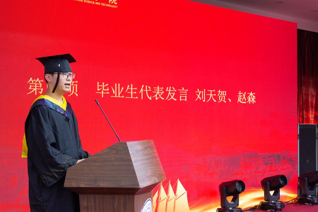 典礼第四项,毕业生代表刘天贺、赵森代表所有毕业生表达了对学院与老师四年辛勤教育的感谢,作为果冻传媒