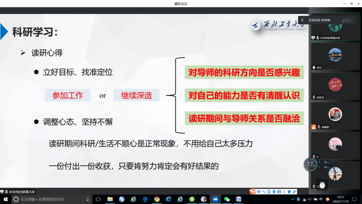 分享者们从论文撰写、科研竞赛、师生关系以及心态调整等各个方面进行了分享,参会者也就自己困惑的地方进行了提问。
