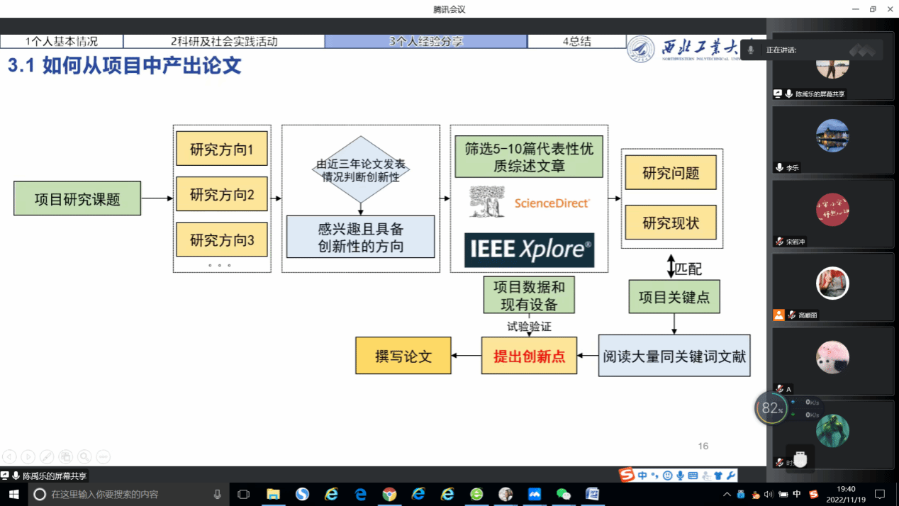 关于如何产出论文:陈禹乐提到,可以大量阅读文献,根据近三年论文发表情况找到创新点,最好能跟项目匹配,再经过不断的实验验证才能产出一篇好的论文。