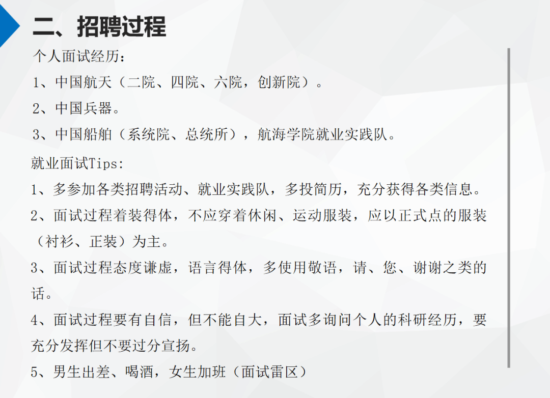 佘俊阳向大家分享了自己的秋招过程,介绍了研究所面试风格与特点,分享了在向位于不同城市的企业投递简历以及面试的时候应注意的细节。详细介绍了自己投递简历、面试、体检以及签约过程,给大家分享了研究所面试时候比较看重的点,给大家重点展开介绍了701所的面试过程。