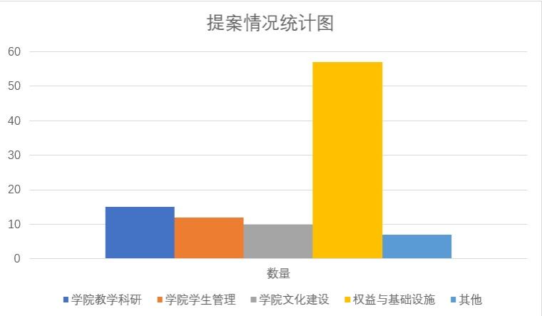 本次提案征集工作总共收集提案102份,其中学院教学科研方面:15份,学院学生管理方面:12份,学院文化建设方面:10份,权益与基础设施方面:57份,其他:7份。