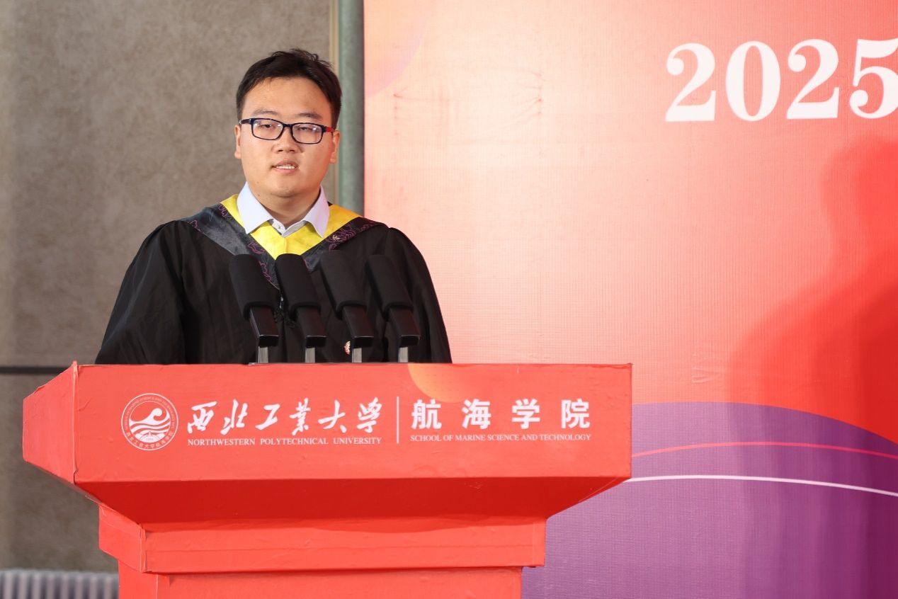 优秀毕业生代表孙博洋发言,他以真挚的语言回顾了大学时光里的成长点滴。他在图书馆挑灯夜战攻克难题,实验室里对实验数据的执着,学科竞赛中团队的默契协作……每一段经历都化作成长的勋章,激励着自己接续奋斗,不停向前。
