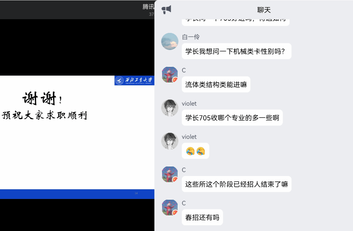 赵帅学长指出,求职前期要从就业地点、薪资水平和科研方向三个维度,明确自身就业选择;通过加入学院就业服务群,关注西工大就业微信公众号、企业公众号进行报名,参加暑期社会实践及研究所暑期开放日等多个途径去寻找就业企业;求职后期要妥善应对无意向招聘企业和硕士毕业答辩。他建议,充分利用课题组资源,多参加项目来丰富自身经历。
