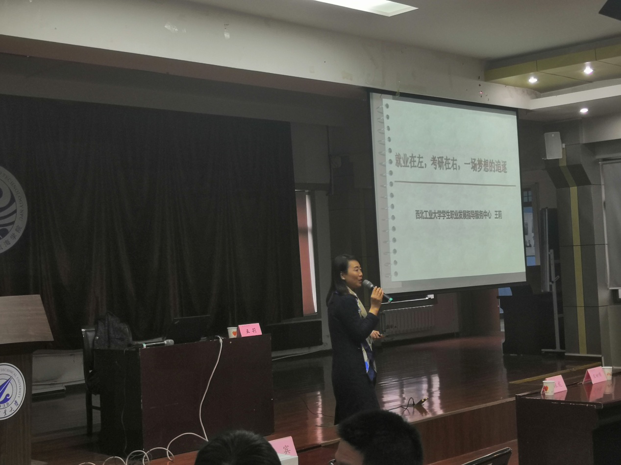 讲座开始前,王莉老师询问了大家考研和就业的筹备情况,与同学们进行了良好的互动。通过一段激励人心的视频,王老师表达了对在场同学们的鼓励,并希望同学们能够正确认识自己选择考研或者就业的目的。王莉老师还拿出具体的统计数据来展示学校以及学院的考研与就业情况,让同学们对全校的情况有更加深刻全面的了解,帮助同学们做出自己的选择。